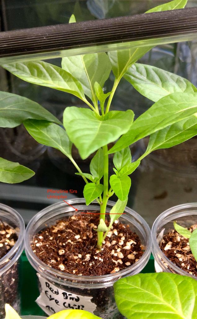 Wenn die Pflänzchen nun die gewünschte Höhe und Anzahl echter Blattpaare erreicht und den bisherigen Topf gut durchwurzelt haben, erfolgt das Umtopfen (und allenfalls Vereinzeln) in einen etwas grösseren Topf (ca. 2-4cm mehr Durchmesser als der alte Topf) mit Drainagelöchern. Beim Anbau von Chili-Pflanzen spielt besonders die Tiefe eines Topf eine entscheidende Rolle. Chillies wurzeln tief und je tiefer sie gehen können, desto grösser wird die Pflanze oberhalb der Oberfläche und desto üppiger wird die Ernte ausfallen. Zum Umtopfen wird neues Substrat in den neuen Topf gegeben. Dieses kann beispielsweise aus einer Mischung aus leicht gedüngter Gemüseerde, Kokoshumus, ein wenig Hornspäne und Perlit bestehen, da so ausreichend Nähr- und Sauerstoff an die Wurzeln kommen kann und die Wasserspeicherfähigkeit, aber auch die Drainage sichergestellt sind. Vor dem Umsetzen der Pflanze können die Keimblätter vorsichtig entfernt werden. Die Pflanze wird nun so tief in das Substrat gesetzt, dass die ersten echten Blätter ca. 1-2cm Abstand zum Substrat haben. Dadurch kann die Pflanze noch mehr Wurzeln ansetzen und stabiler wachsen. Die Wurzel-Enden sollten alle nach unten zeigen. Nun wird das Pflänzchen kräftig gegossen, damit es anwachsen kann. Achte darauf, dass das Substrat in der ersten Woche leicht feucht ist, anschliessend kann es fast austrocknen vor dem nächsten Giessen. Gedüngt werden muss dank dem frischen Substrat erst nach ca. 2-3 Wochen. Hierfür empfiehlt sich ein Flüssigdünger, der genau dosiert werden kann und mit dem Giesswasser verabreicht wird.